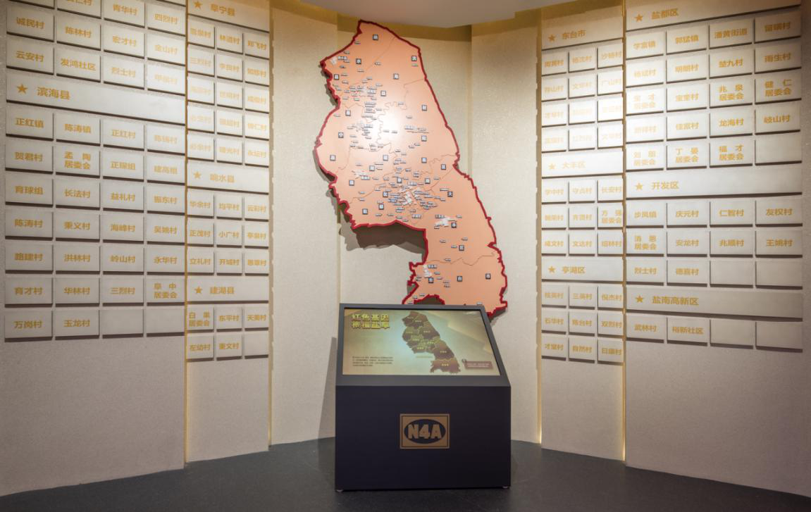 鹽城新四軍紀(jì)念館是全國(guó)唯一的專業(yè)性新四軍紀(jì)念館。醒目的藍(lán)白相間的“N4A”臂章圖案,鑲嵌在展廳正門上方,兩側(cè)旗形的花崗石陰雕畫,藝術(shù)地再現(xiàn)了新四軍與八路軍在白駒獅子口勝利會(huì)師和皖南事變后新四軍在鹽城重建軍部的歷史場(chǎng)面。