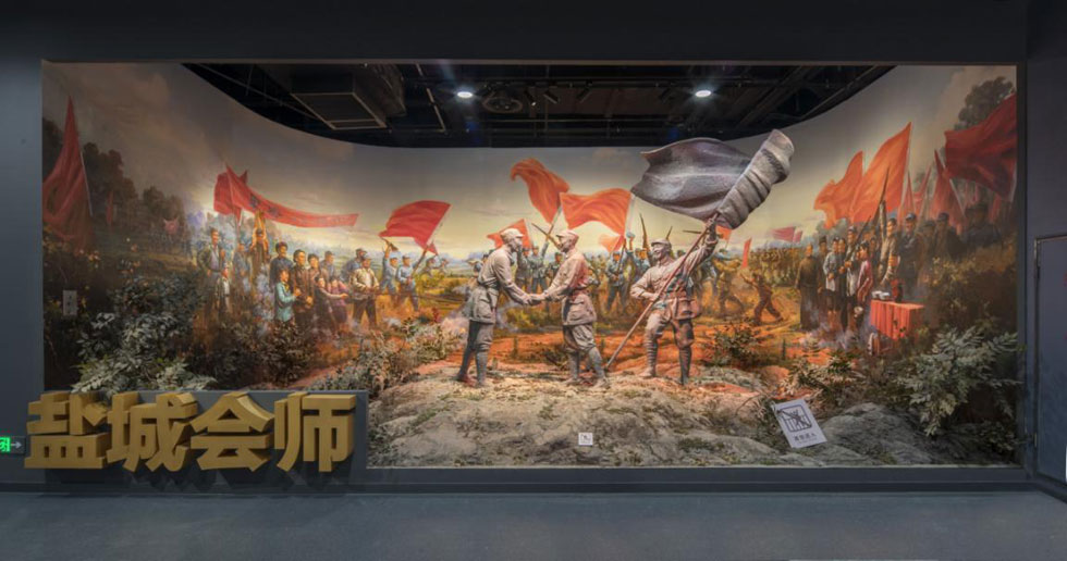 鹽城新四軍紀(jì)念館是全國唯一的專業(yè)性新四軍紀(jì)念館。醒目的藍(lán)白相間的“N4A”臂章圖案,鑲嵌在展廳正門上方,兩側(cè)旗形的花崗石陰雕畫,藝術(shù)地再現(xiàn)了新四軍與八路軍在白駒獅子口勝利會(huì)師和皖南事變后新四軍在鹽城重建軍部的歷史場(chǎng)面。